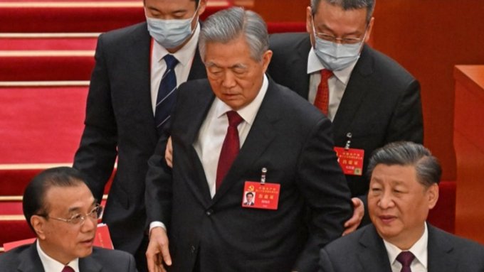 Η στιγμή που σωματοφύλακες του Προέδρου της Κίνας πετάνε έξω τον 80χρονο πρώην Πρόεδρο της χώρας από το συνέδριο του Κόμματος, επειδή δεν τον ήθελε δίπλα του ο Σι Τζινπίνγκ. Η σκηνή ούτε μεταδόθηκε από τα μέσα της Κίνας, ούτε δόθηκε εξήγηση για το συμβάν..