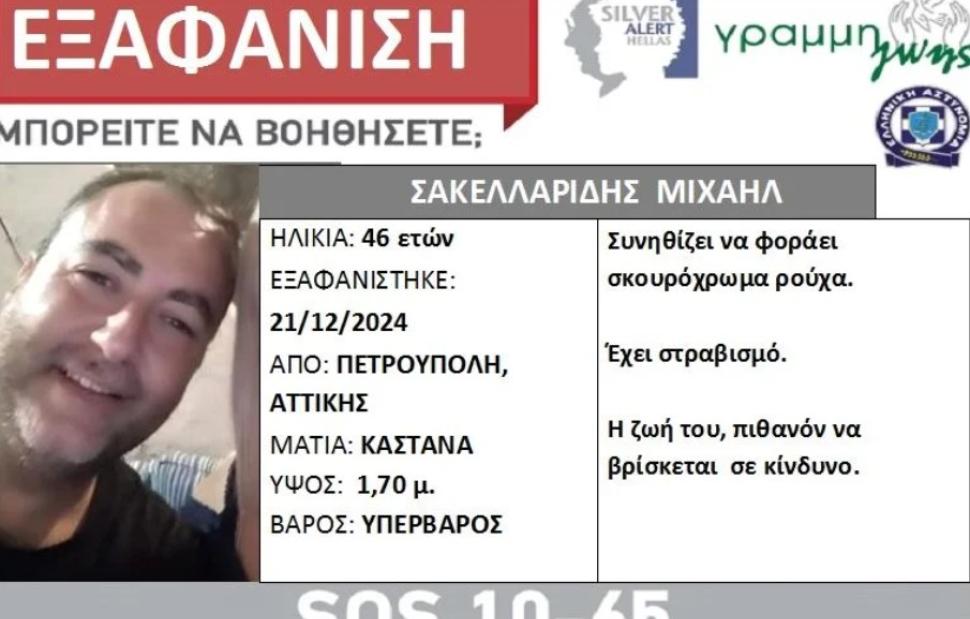 Silver Alert έχει εκδοθεί για την υπόθεση εξαφάνισης ενός 46χρονου άνδρα από την Πετρούπολη. Παράλληλα, αναζητούνται και οι γονείς του.