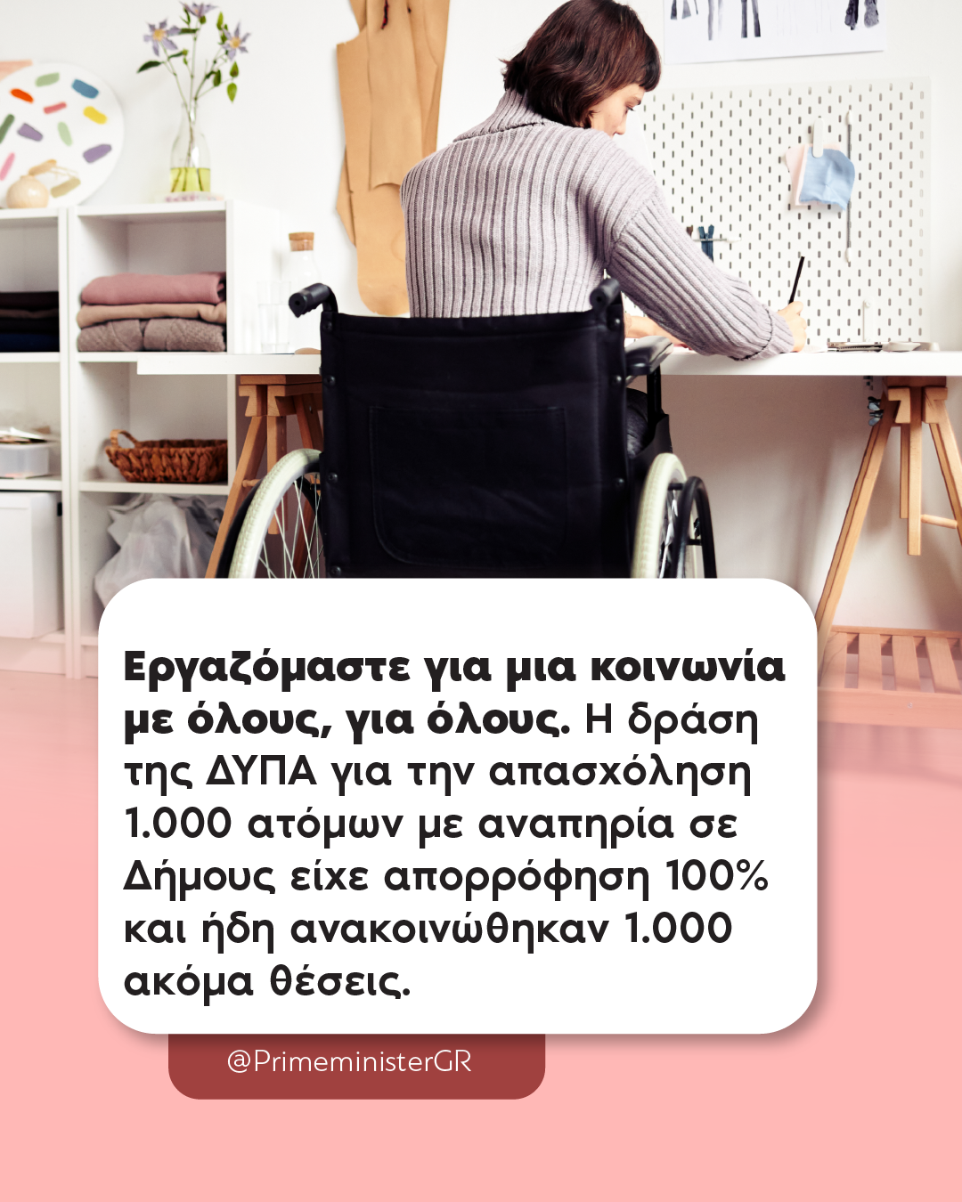 Άξια ιδιαίτερης μνείας και συγχαρητηρίων είναι η δράση για την απασχόληση ατόμων με αναπηρία σε δήμους, η οποία είχε απορρόφηση 100% και ήδη ανακοινώθηκαν επιπλέον 1.000 θέσεις. Γιατί μια κοινωνία είναι δίκαιη μόνο όταν δεν αφήνει κανέναν πίσω.