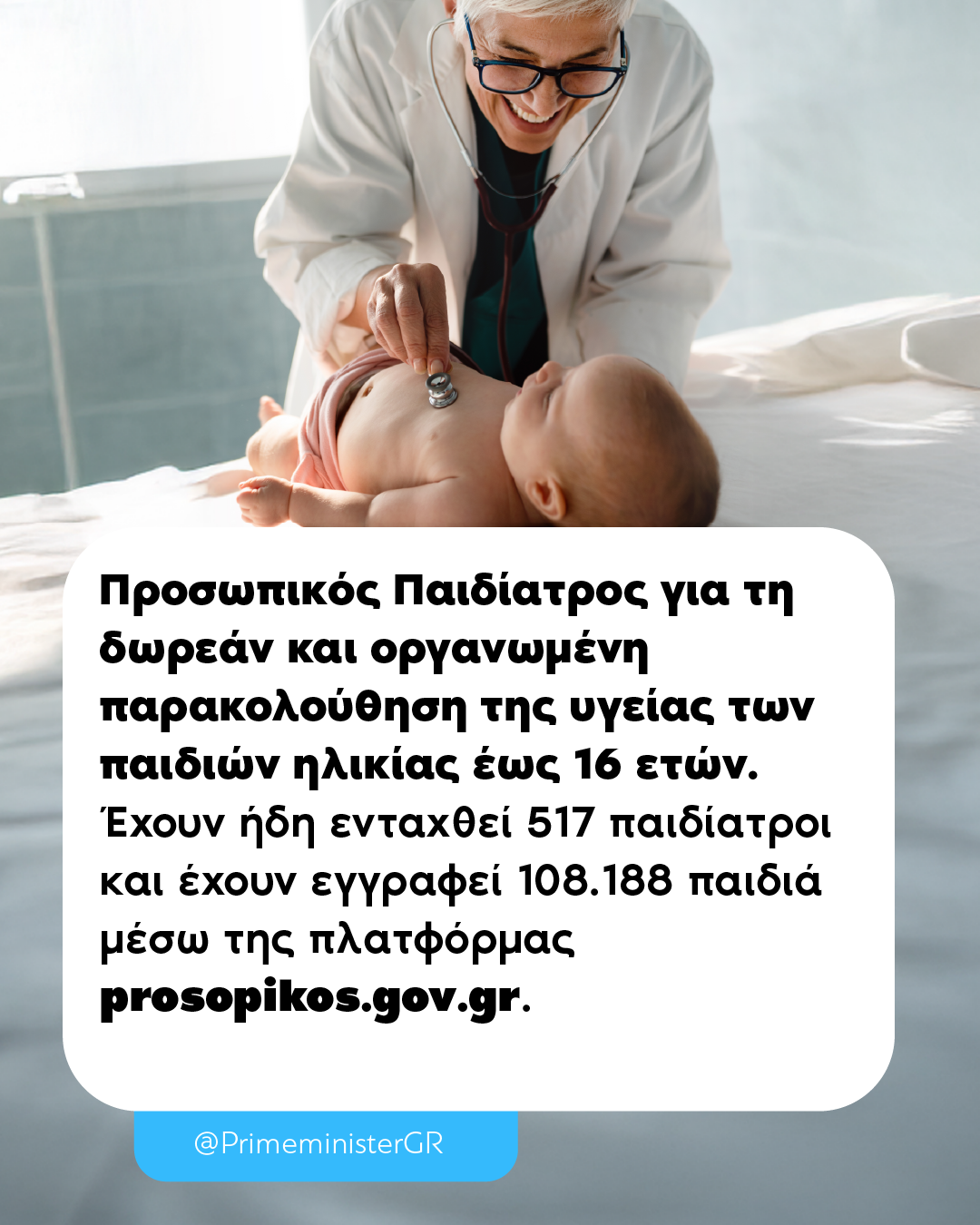 Να δούμε και τα νεότερα σχετικά με την ανταπόκριση γιατρών και γονιών στον θεσμό του Προσωπικού Παιδιάτρου που για πρώτη φορά εφαρμόζεται στη χώρα μας. Ήδη έχουν ενταχθεί στο σύστημα της ΗΔΙΚΑ 517 παιδίατροι, που σημαίνει ότι το διαθέσιμο δυναμικό αρκεί για την κάλυψη περισσότερων από 750.000 παιδιά, κατά πολύ περισσότερων από τον αρχικό στόχο των 500.000 παιδιών που είχε τεθεί από το Υπουργείο Υγείας. Πάνω από 108.188 παιδιά έχουν ήδη εγγραφεί μέχρι σήμερα, με 12.251 μόνο τους τελευταίους 2 μήνες μέσω της πλατφόρμας prosopikos.gov.gr, κάτι που δείχνει ότι οι…