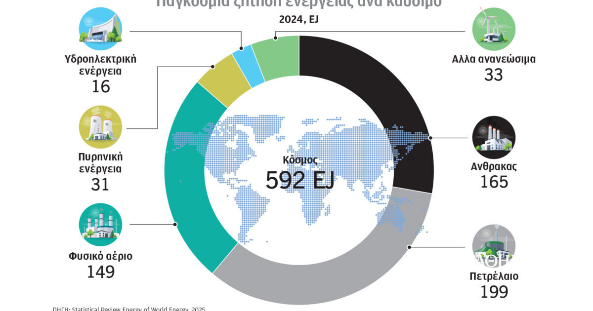 Eρευνα – Ανάλυση: καθ. Γιάννης ΜανιάτηςΜε τη συνεργασία των μεταπτυχιακών φοιτητών/τριών: Ι. Βούλγαρη, Α. Μανώλη Α. και του κ. Χ. Συριόπουλου Για το 2024, η παγκόσμια ζήτηση ενέργειας αυξήθηκε κατά 2% σε σχέση με το προηγούμενο έτος, με τα ορυκτά καύσιμα να κυριαρχούν, καλύπτοντας το 87% του ενεργειακού μείγματος (πετρέλαιο 34%, φυσικό αέριο 25% και άνθρακας 28%), ενώ πυρηνικά, υδροηλεκτρικά και άλλα ανανεώσιμα αντιπροσώπευαν περίπου το 13%. Για το ίδιο έτος, η παγκόσμια ετήσια αύξηση για ορυκτά καύσιμα άγγιξε το 1,6%, ενώ για πυρηνικά, υδροηλεκτρικά και άλλα ανανεώσιμα το 7%.…
