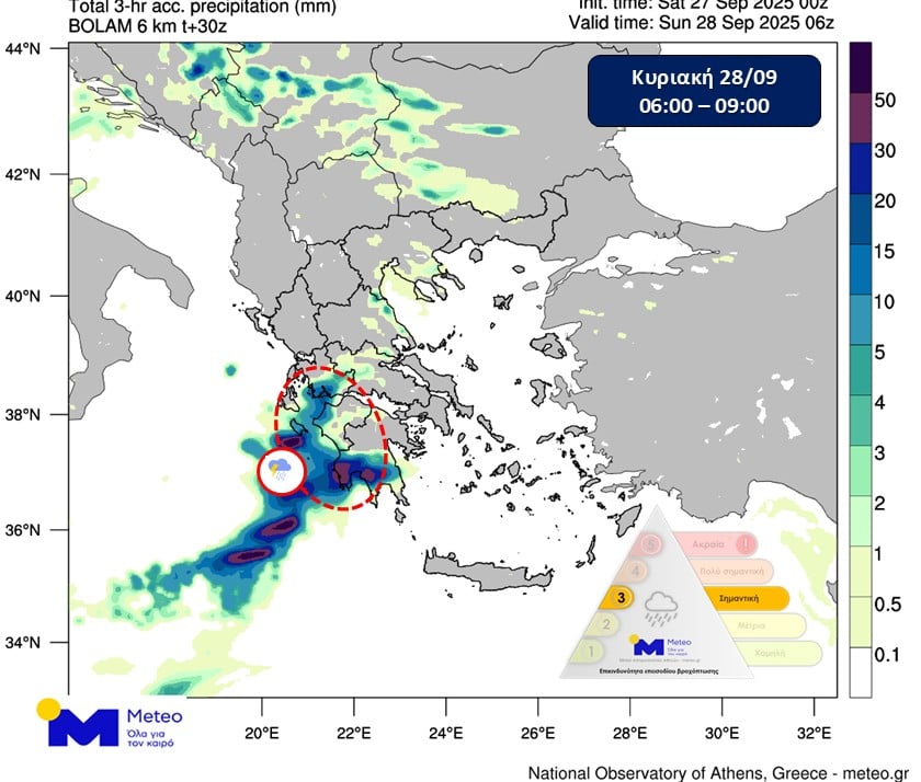 Πιο συγκεκριμένα, ισχυρές βροχές και καταιγίδες προβλέπονται από αργά το βράδυ του Σαββάτου μέχρι και το βράδυ της Κυριακής: στο Ιόνιο (περιοχή Ζακύνθου, Κεφαλονιάς, Ιθάκης, Λευκάδας), την Αιτωλοακαρνανία, τη δυτική Πελοπόννησο (Αχαΐα, Ηλεία, Μεσσηνία) και τις νότιες περιοχές της Ηπείρου (νομοί Άρτας και Πρέβεζας).