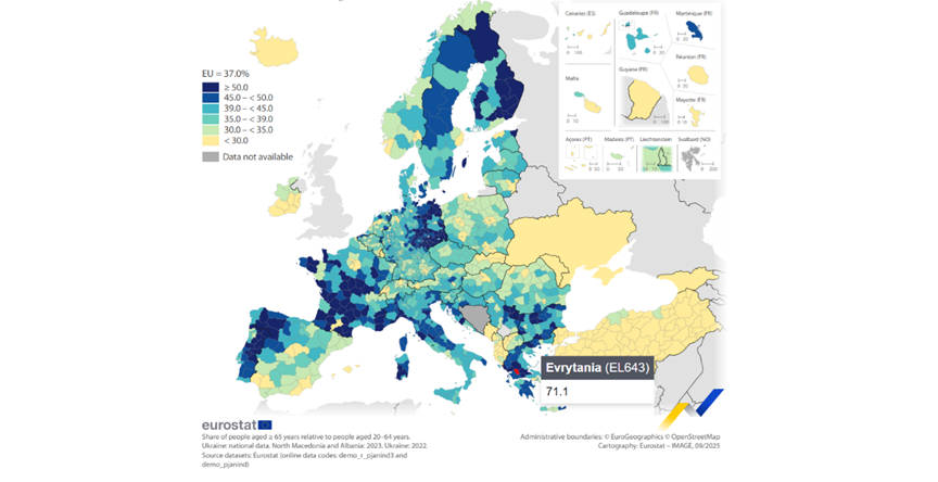 Το 2004, ο δείκτης βρισκόταν στο 26,8%. Η αναλογία αυτή σήμαινε ότι αντιστοιχούσαν περίπου τέσσερις πολίτες σε ηλικία εργασίας για κάθε άτομο μεγαλύτερο των 65 ετών. Είκοσι χρόνια αργότερα, την 1η Ιανουαρίου 2024, ο δείκτης είχε εκτοξευθεί στο 37%. Η δημογραφική γήρανση στην Ευρώπη δεν αποτελεί πλέον μια μελλοντική πρόβλεψη αλλά μια απτή πραγματικότητα που αποτυπώνεται με σαφήνεια στα επίσημα στοιχεία της Eurostat. Ο δείκτης εξάρτησης ηλικιωμένων, δηλαδή η αναλογία των ατόμων άνω των 65 ετών σε σχέση με τον πληθυσμό εργάσιμης ηλικίας, παρουσιάζει συνεχή και έντονη αύξηση τις τελευταίες…