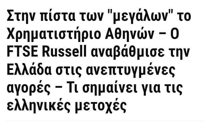 Ο διεθνής οίκος FTSE Russell με ανακοίνωσή του αναβαθμίζει την ελληνική κεφαλαιαγορά από την κατηγορία των Προηγμένων Αναδυόμενων Αγορών στην κατηγορία των Ανεπτυγμένων Αγορών (Developed Markets). Η αναβάθμιση αυτή αποτελεί ορόσημο για την εγχώρια κεφαλαιαγορά και αντανακλά την πρόοδο που έχει σημειωθεί στην ελληνική οικονομία τα τελευταία χρόνια. Η απόφαση του FTSE Russell βασίστηκε στην εκπλήρωση όλων των απαιτούμενων κριτηρίων, συμπεριλαμβανομένης της πρόσφατης αναβάθμισης της πιστοληπτικής ικανότητας της χώρας από τον διεθνή οίκο αξιολόγησης Moody’s. Η ένταξη του Χρηματιστηρίου Αθηνών στις Ανεπτυγμένες Αγορές αναμένεται να ενισχύσει καθοριστικά την εμπιστοσύνη της…