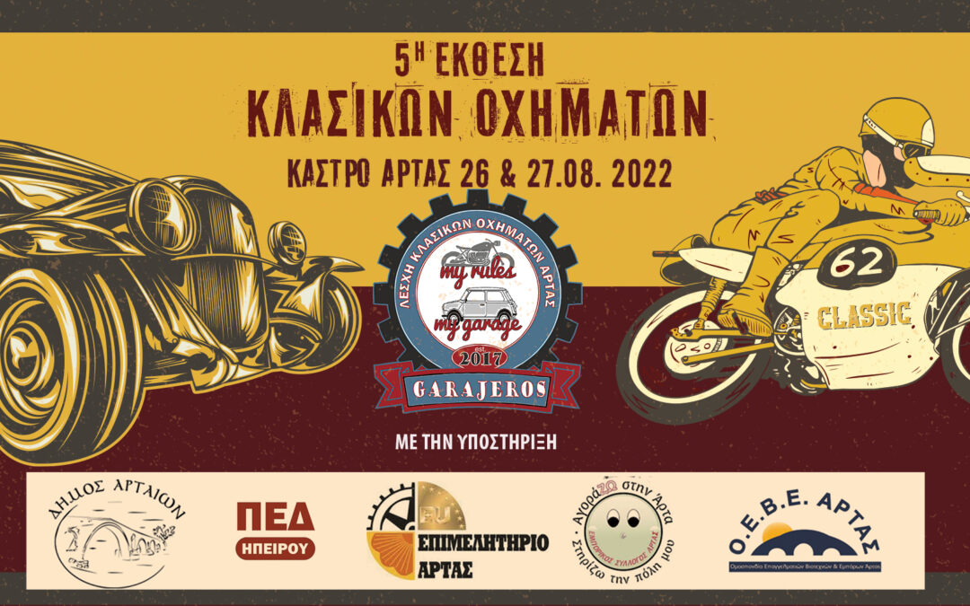 Η Λέσχη Κλασικών Οχημάτων Άρτας, προσκαλεί όλους του λάτρεις των κλασικών μοτοσικλετών και των κλασικών αυτοκινήτων, στην 5η έκθεση κλασικών οχημάτων που θα πραγματοποιηθεί στην πόλη της Άρτας και πιο συγκεκριμένα στον εσωτερικό χώρο του Κάστρου της Άρτας την Παρασκευή 26 και το Σάββατο 27 Αυγούστου το απόγευμα.