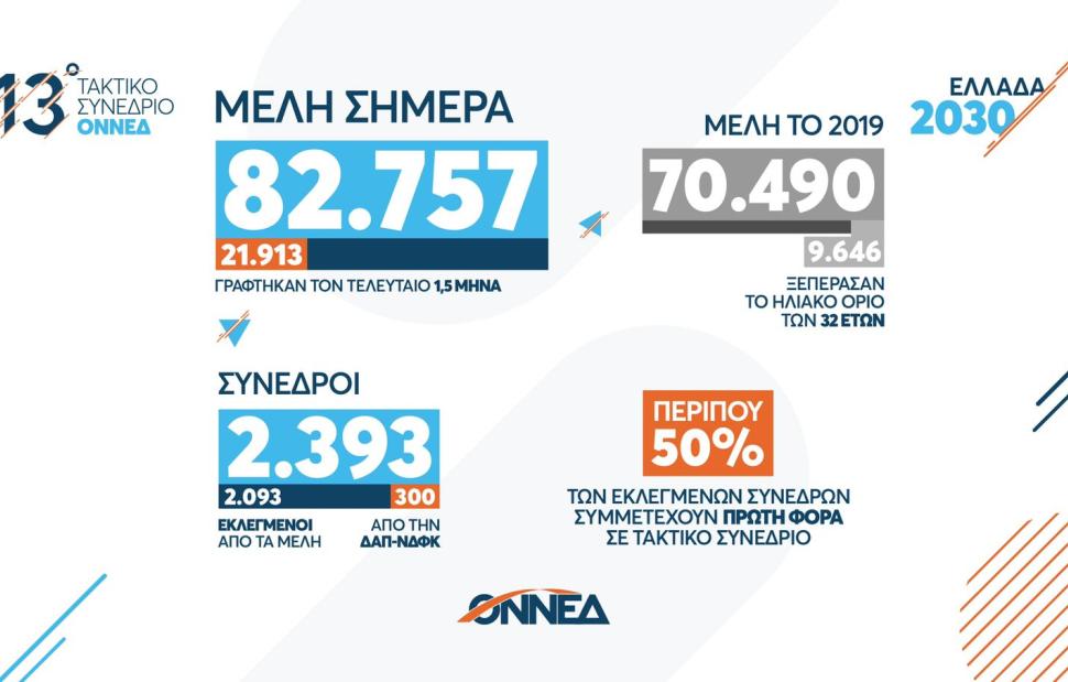 Συνολικά στο Εθνικό Μητρώο Μελών της ΟΝΝΕΔ είναι πλέον εγγεγραμμένα 82.757 μέλη. Αναδείχθηκαν 2.093 σύνεδροι, αριθμοί αυξημένοι από τους αντίστοιχους του Συνεδρίου του 2019, ενώ θα επικυρωθούν και 300 σύνεδροι προερχόμενοι από τη ΔΑΠ-ΝΔΦΚ κατά την πρώτη ημέρα του Συνεδρίου.