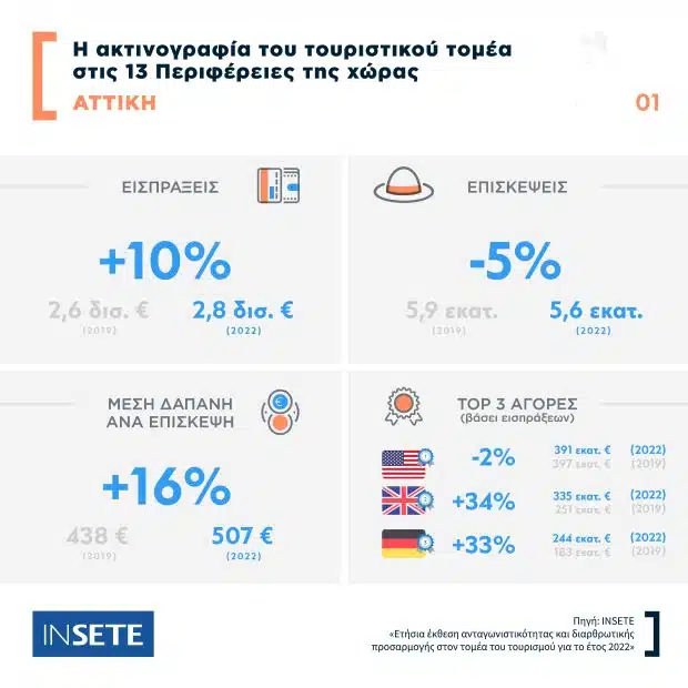 Τα τουριστικά μεγέθη και τη διαφορετική ταυτότητα των προορισμών ανά την Ελλάδα αναδεικνύουν οι ετήσιες εκθέσεις του Ινστιτούτου του Συνδέσμου Ελληνικών Τουριστικών Επιχειρήσεων (ΙΝΣΕΤΕ) με τα επιμέρους χαρακτηριστικά για τις 13 Περιφέρειες, προτάσσοντας τις αναγκαίες πρωτοβουλίες για τη χάραξη συγκεκριμένης περιφερειακής τουριστικής πολιτικής.