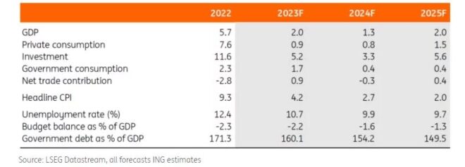 Πέρα από την καθαρή επίδραση της μείωσης του κόστους εξυπηρέτησης του χρέους, η ανάκτηση της επενδυτικής βαθμίδας θα μπορούσε επίσης να βοηθήσει την Ελλάδα, καθιστώντας την πιο ελκυστική για άμεσες ξένες επενδύσεις. Κάτι τέτοιο θα μπορούσε να αναθεωρήσει τις προβλέψεις της ING για το ελληνικό ΑΕΠ προς τα πάνω, οι οποίες επί του παρόντος διαμορφώνονται στο 1,3% το 2024.